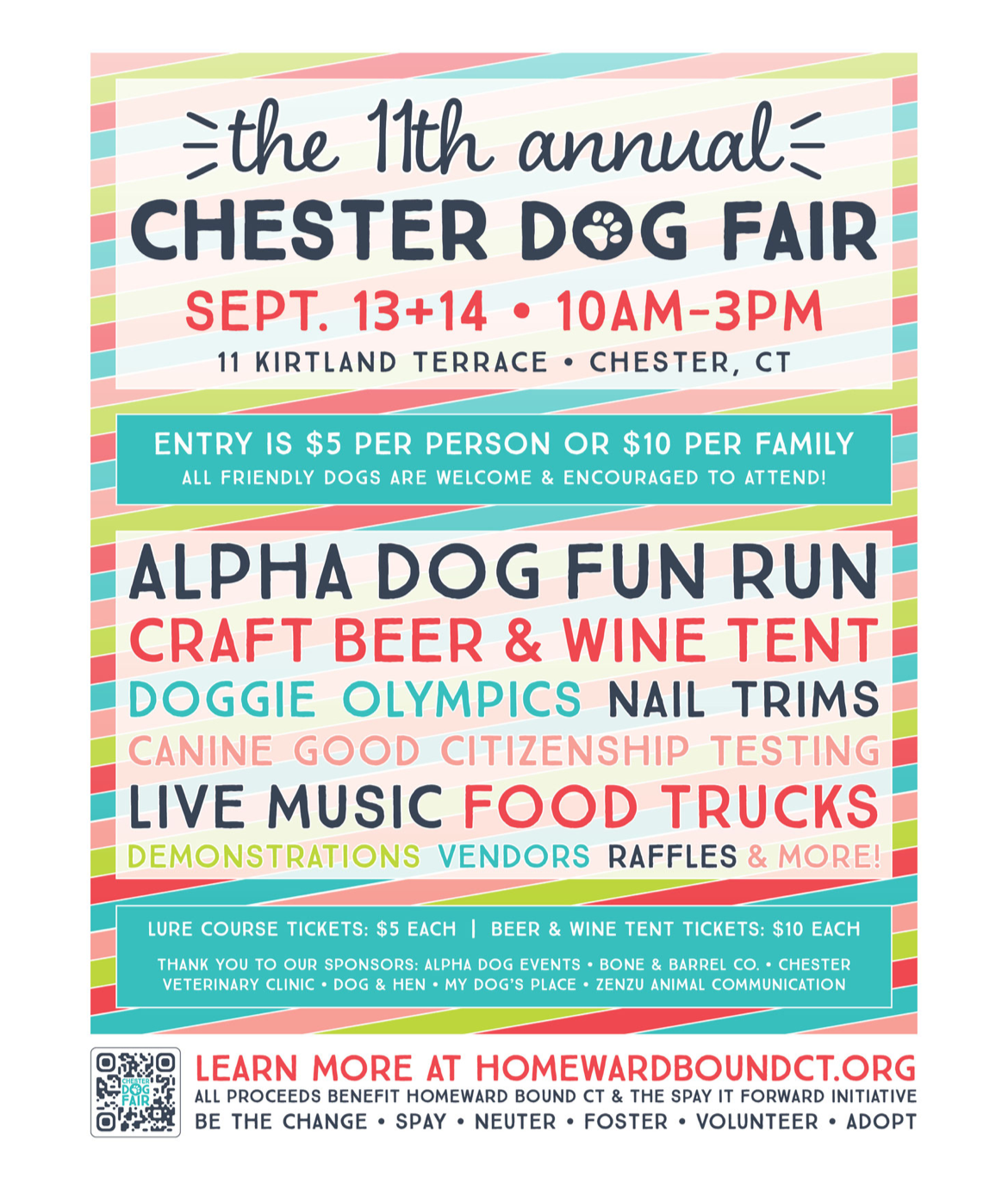 Our event has grown from the steps of the Chester Meeting House to the Chester Fairgrounds to accommodate the 65+ vendors that join us each year. While it was originally intended just for fun, it has quickly become Homeward Bound CT’s biggest fundraiser, which enables us to continue our mission. Here current and potential dog owners will find out what’s available in their area to help their dog thrive. From dog trainers to dog treat vendors, Animal communicators to Poop’n Scoop people who come pick up dog poop! WHAT? We have a huge variety of vendors and they are still signing up.
